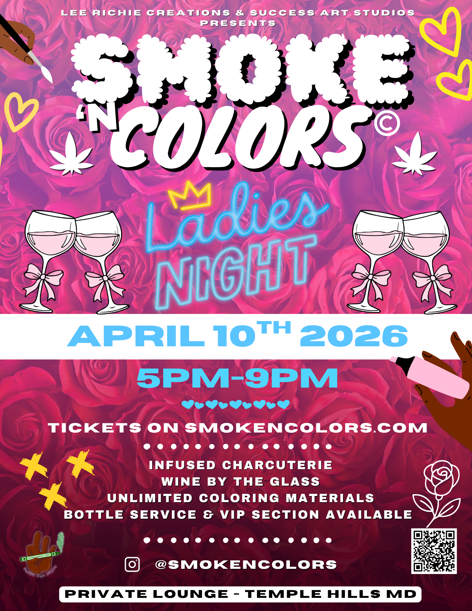 We are thrilled to present to you Smoke’n Colors Ladies Night, a curated night out for the girls, designed to bring you and your crew together for an evening of creativity, connection, and unforgettably immaculate vibes.